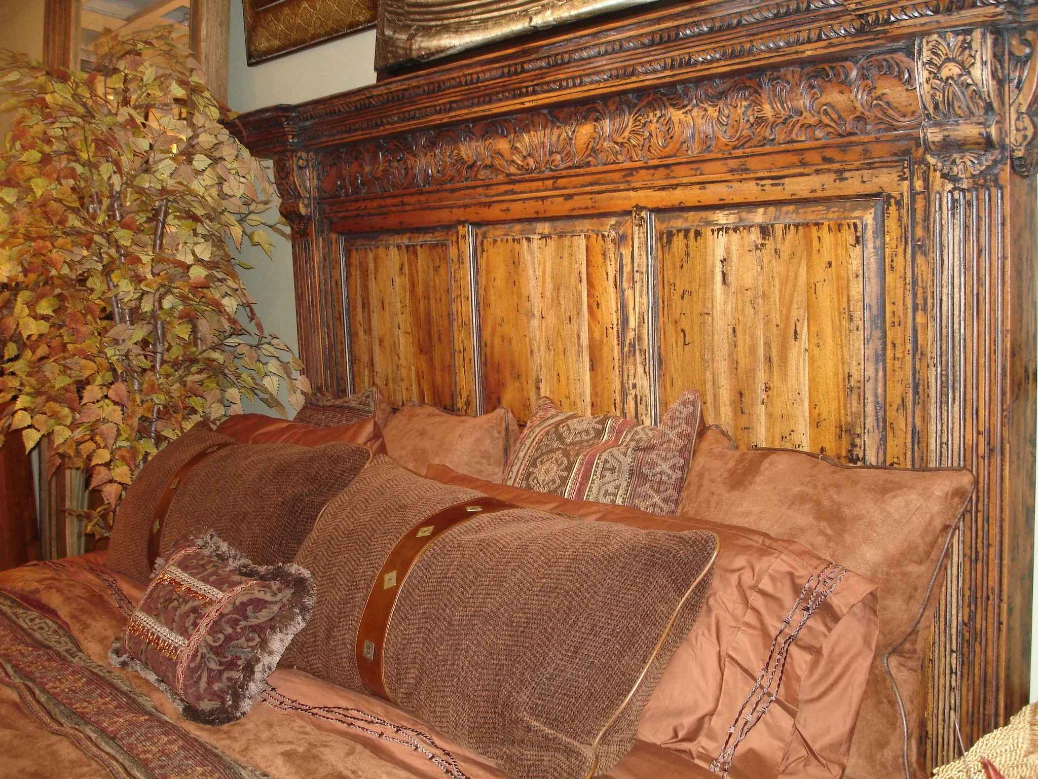 This photo simply does not do this bed justice. Built of solid mahogany it comes from a company that specializes in unique stains and painted distressed finishes. There are matching dressers, chest of drawers, night stands and a large leaning mirror available; all statement pieces. Imagine this bed in a light driftwood finish and the look is entirely different. This bed has a high headboard and takes a large room.