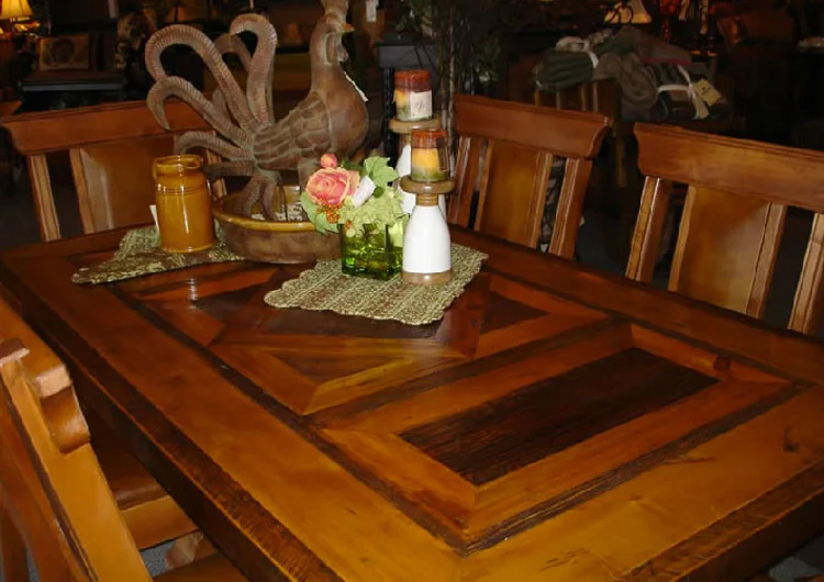 Made of old reclaimed barn wood, this table is an instant family heirloom. This builder creates furniture full of character with no two dining tables looking exactly the same. This can be built with leaves or without in almost any size and height you might ever need. It doesn't have to have this exact top pattern either. Please let us know if you would like for us to send photos of other choices. This is why we love furnishings made in America, it is no problem to get a table custom sized to fit your home.
